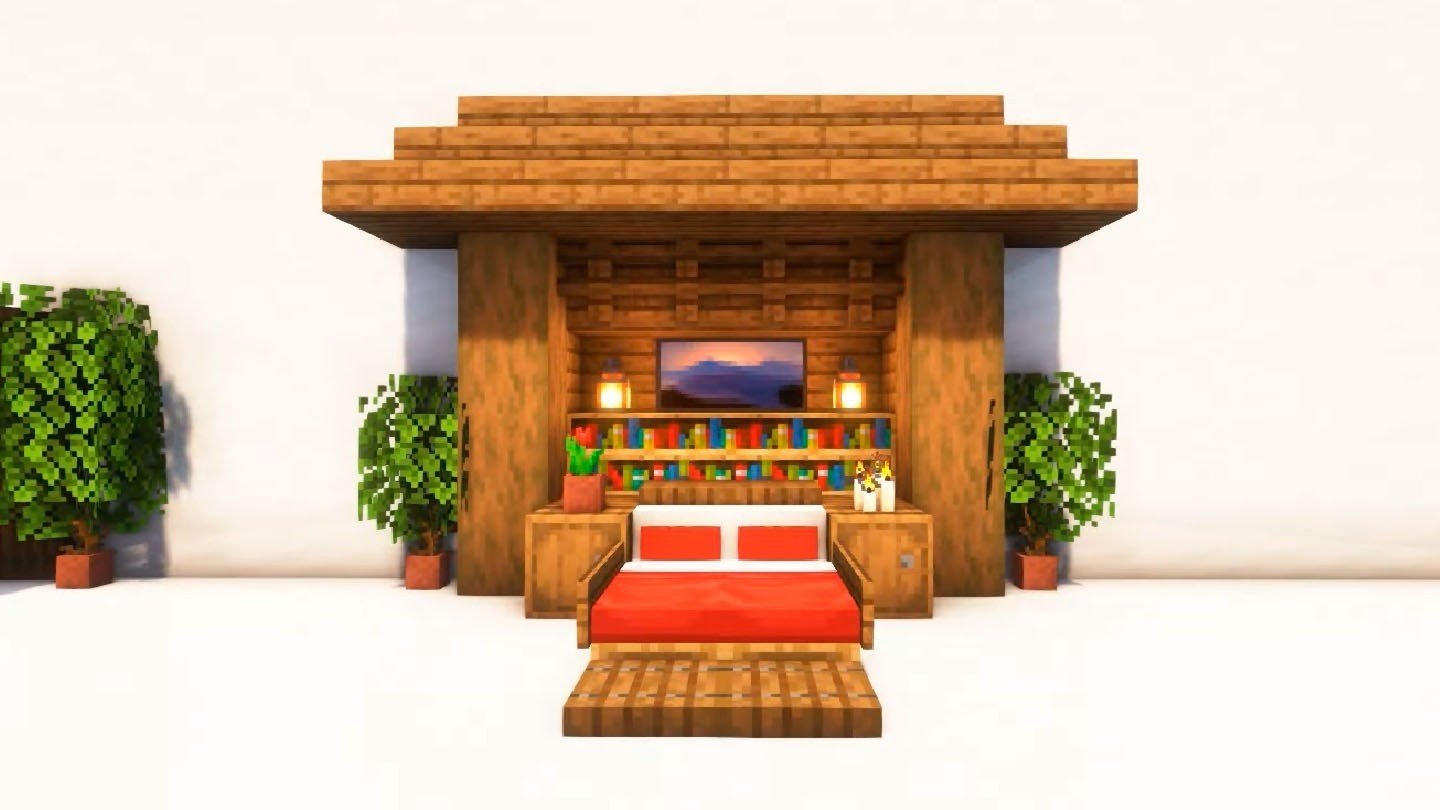 An excellent solution if you’re playing with your significant other and are tired of just placing two beds next to each other: you want family coziness, romance. To create such furniture, build a frame from wooden blocks, and place trapdoors on them. You can use ladders as the headboard, and a wool block on the floor will create the feel of a carpet. This interesting build in Minecraft idea will allow you to create a unique piece of furniture.