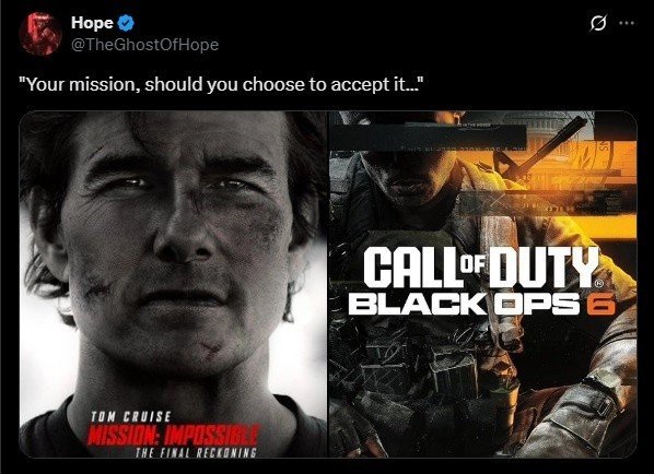 A Activision parece ter abraçado de vez o estilo Fortnite: quanto mais crossovers, melhor. E o próximo pode ser dos grandes. Segundo rumores, Call of Duty: Black Ops 6 deve receber um evento especial de Missão: Impossível muito em breve. O insider TheGhostOfHope publicou um tweet deixando pouca dúvida — ainda mais considerando que o novo filme com Tom Cruise estreia no dia 23 de maio.