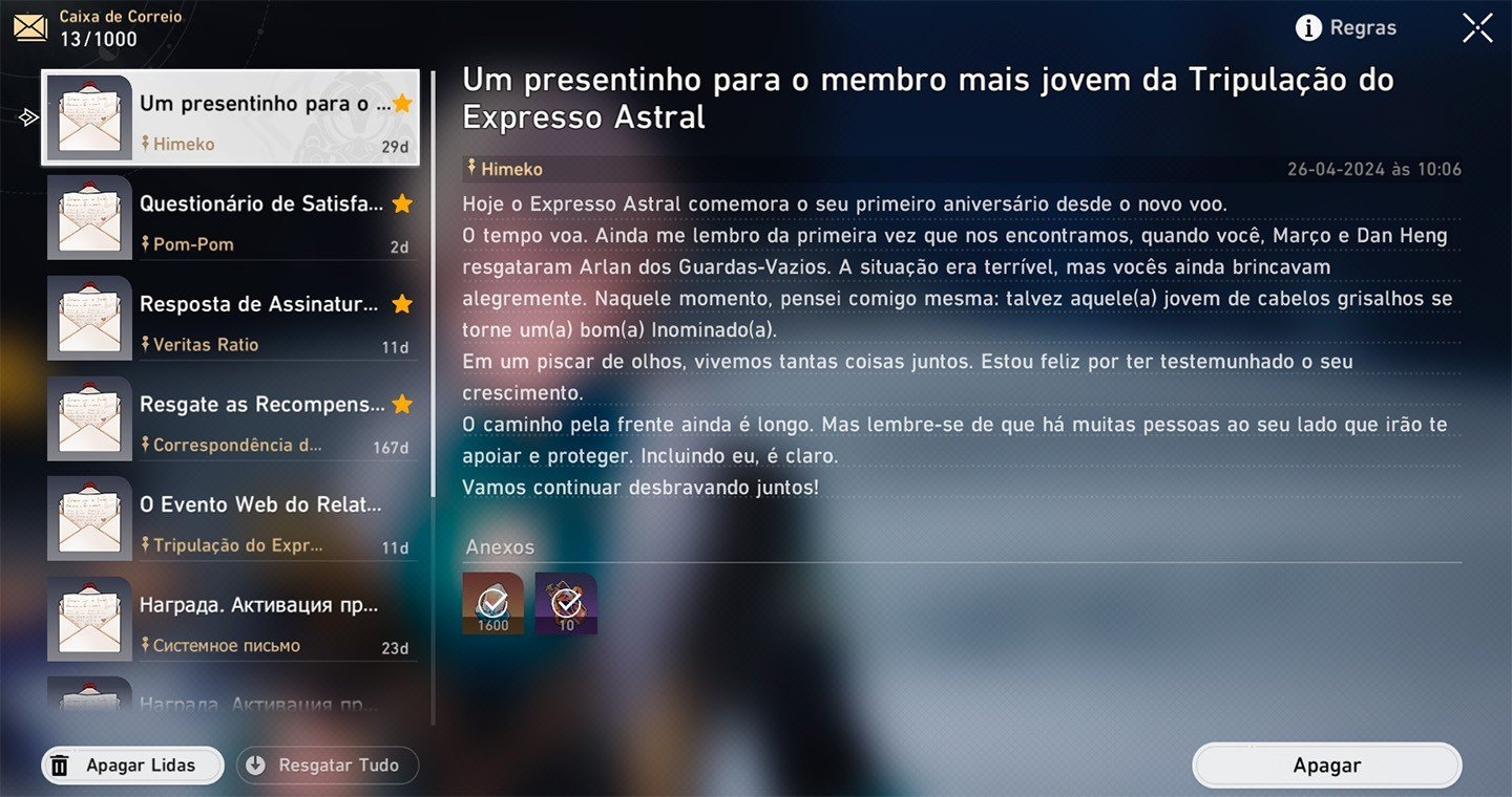 No dia 26 de abril, cada jogador receberá um e-mail no jogo com 1 600 Stellar Jade, a moeda usada para comprar bilhetes de teletransporte. No mesmo dia, uma transmissão ao vivo dos desenvolvedores acontecerá, oferecendo códigos promocionais para mais 300 Stellar Jade.